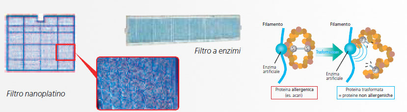 | L'elevato potere ossidante delle nano-particelle di platino che costituiscono questo nuovo filtro dell'aria, consente di neutralizzare batteri, virus, allergeni e cattivi odori. La superficie irregolare del filtro stesso è più efficace nella cattura delle polveri ed una semplice e regolare pulizia lo mantiene in perfetta efficienza per oltre 10 anni. Il filtro agli enzimi antiallargie opzionale è in grado di garantire aria ancora più pulita e salubre. Uno speciale catalizzatore posto sul filamento del filtro cattura e favorisce la decomposizione delle sostanze allergiche normalmente presenti nelle abitazioni. |