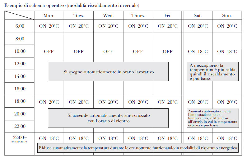 | Grazie al nuovo timer settimanale, provvisto di quattro differenti programmazioni su ciclo giornaliero, è possibile non solo programmare l'accensione e lo spegnimento, ma anche una temperatura differente nel corso della giornata. |