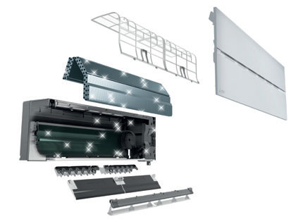 La geometria totalmente rivoluzionaria del doppio deflettore garantisce una distribuzione dell’aria ottimale; è possibile direzionare indipendentemente i flussi d’aria in uscita dal lato destro e sinistro dell’unità.