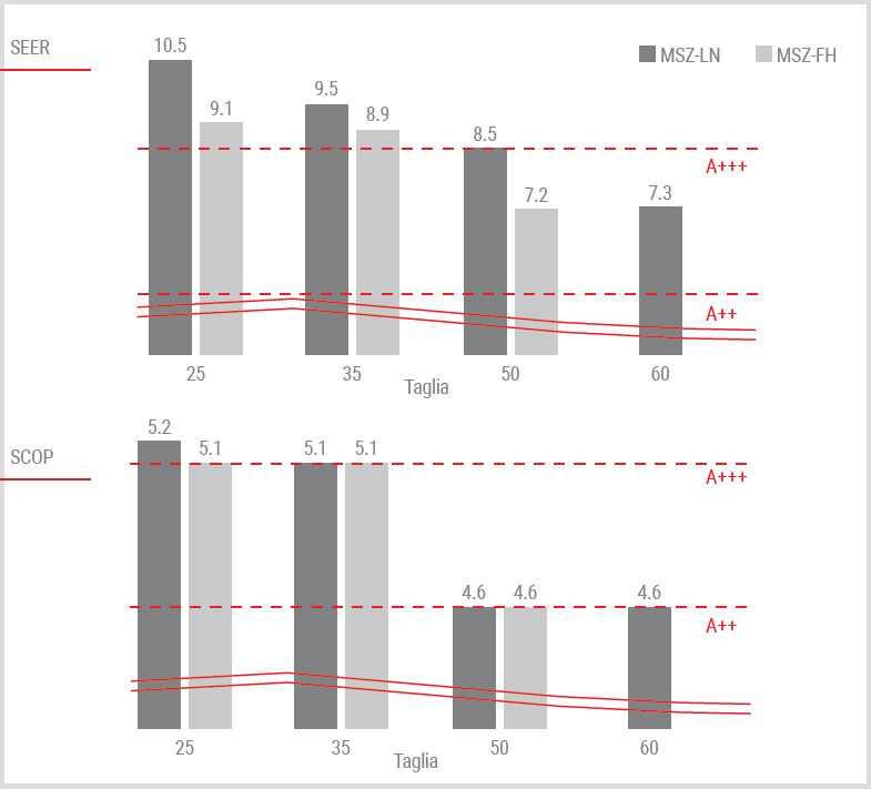 La serie MSZ-LN VG, grazie alle sue prestazioni d’eccellenza, può fregiarsi della massima classe di efficienza (A+++) sia in riscaldamento che in raffrescamento.