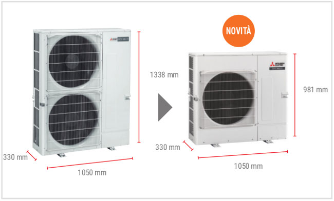 La nuova PUMY-SP garantisce la potenza e le prestazioni dei sistemi VRF in applicazioni residenziali con un ingombro significativamente ridotto rispetto al passato, grazie al nuovo design con un solo ventilatore.